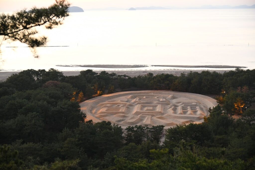 JR観音寺駅から約2kmに位置する琴弾公園の有明浜には、東西122m、南北90m、周囲345mにもおよぶ巨大な砂絵「寛永通宝」が描かれています。