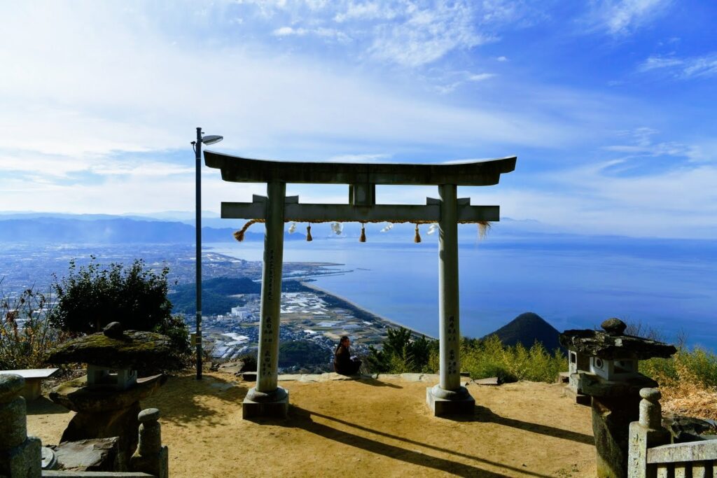 標高404mの稲積山頂上に鎮座する高屋神社本宮。「天空の鳥居」として全国的に有名になったこの絶景スポットは、眼下に観音寺市街と瀬戸内海の島々を一望できるパノラマビューが広がります。